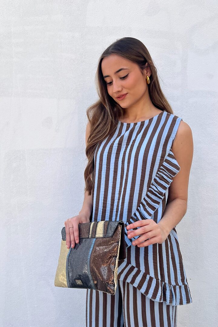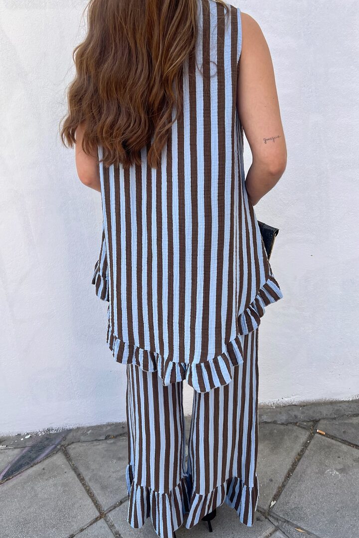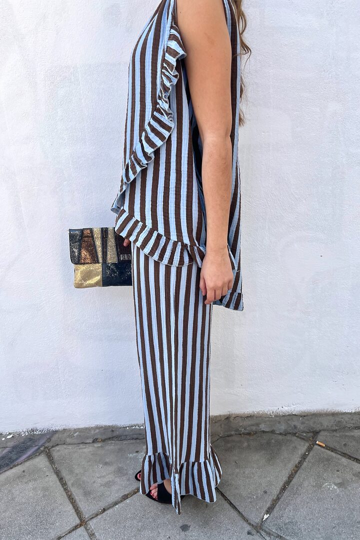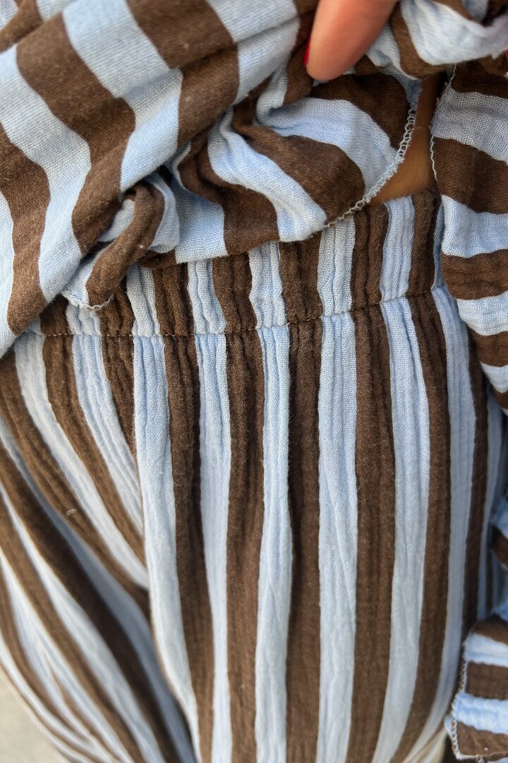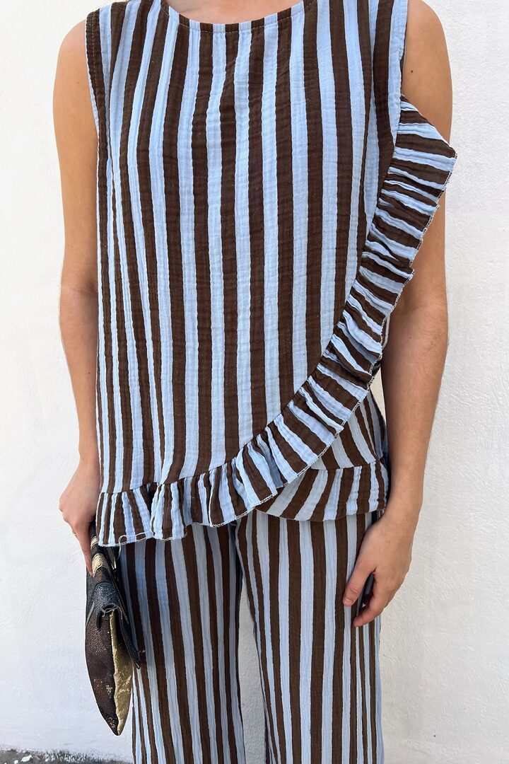 Popeye Blue Set. A stylish and comfortable summer set featuring a loose-fitting top and trousers. Made from a soft, thick cotton fabric. The trousers have a straight leg with a ruffled hem and an elasticated waistband, while the top is an oversized A-line style.