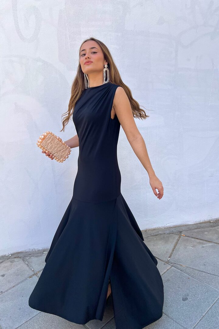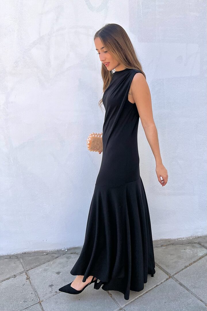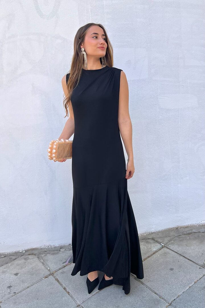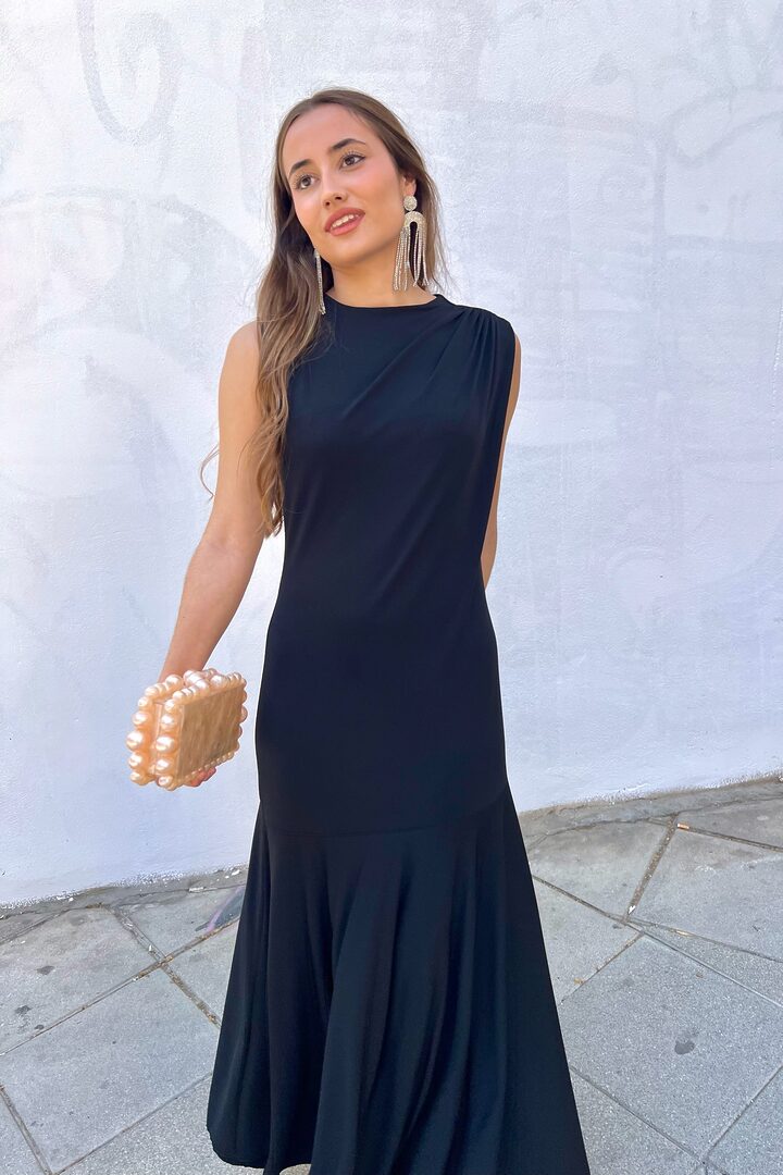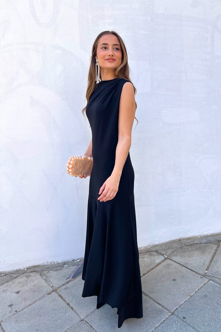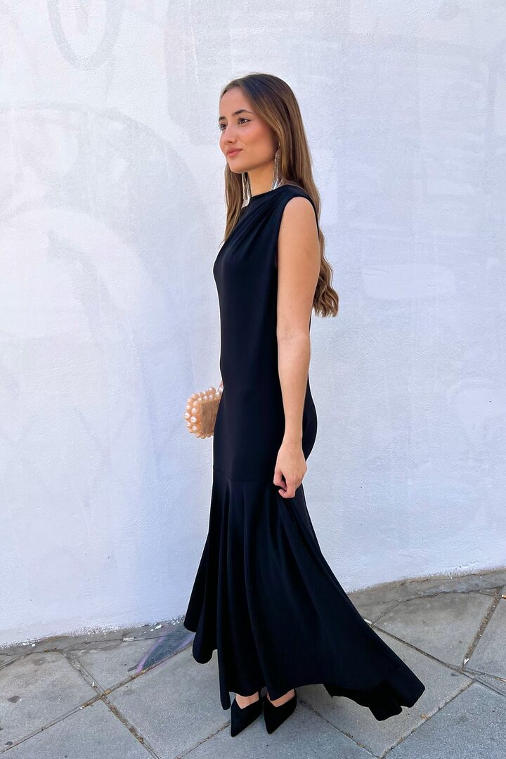 Dorotea Black Dress. This simple yet elegant dress is a great wardrobe staple for this season. Made from satin with elastane, it features a ruffle detail on one shoulder and is fully lined. The double-layered ruffle at the hem adds a special touch and elegant movement.