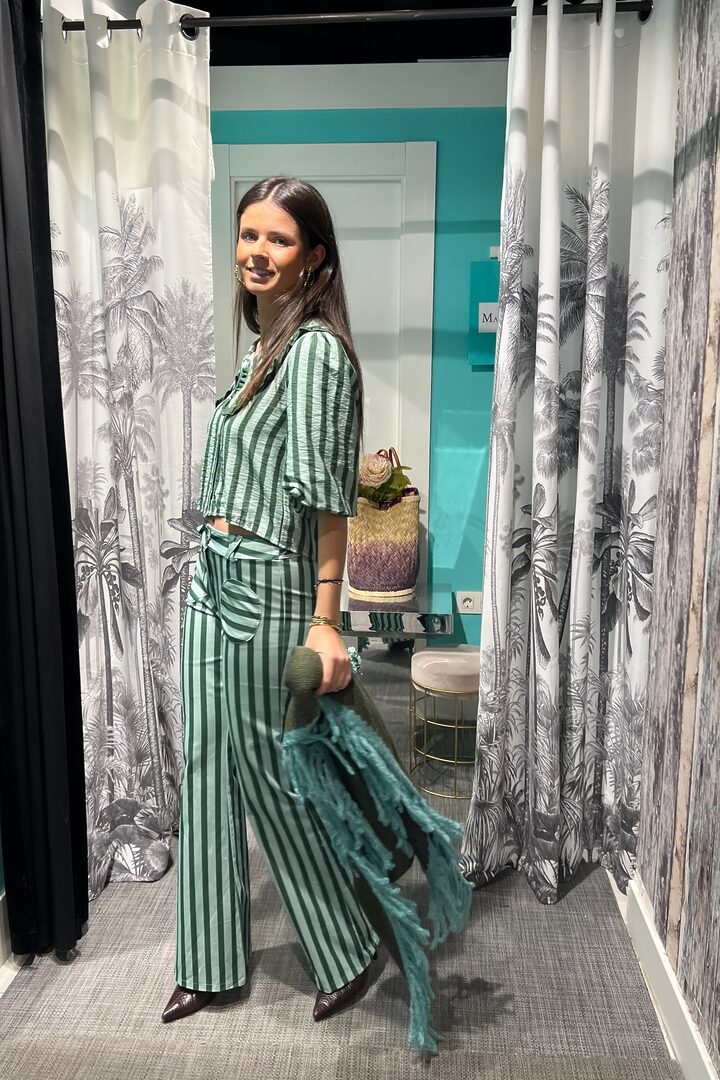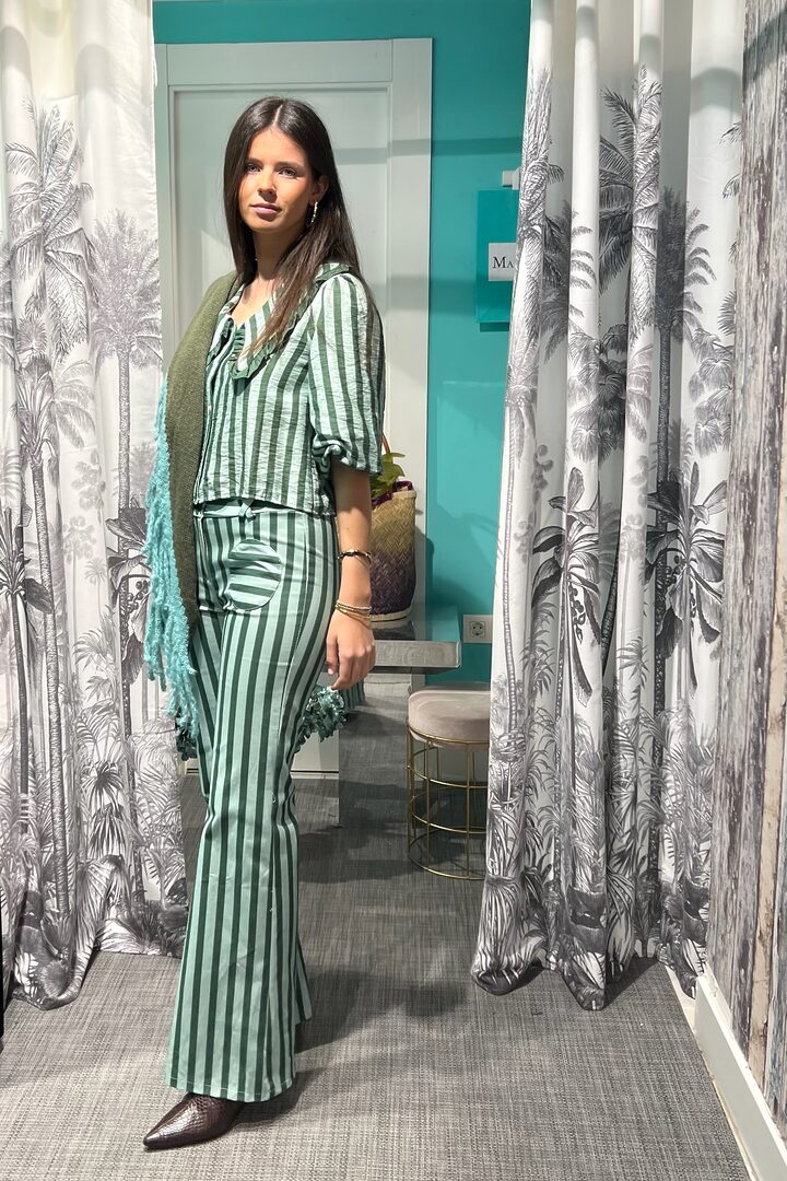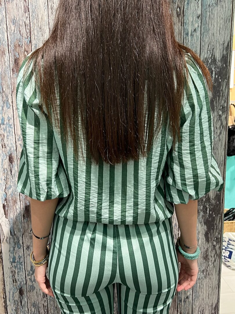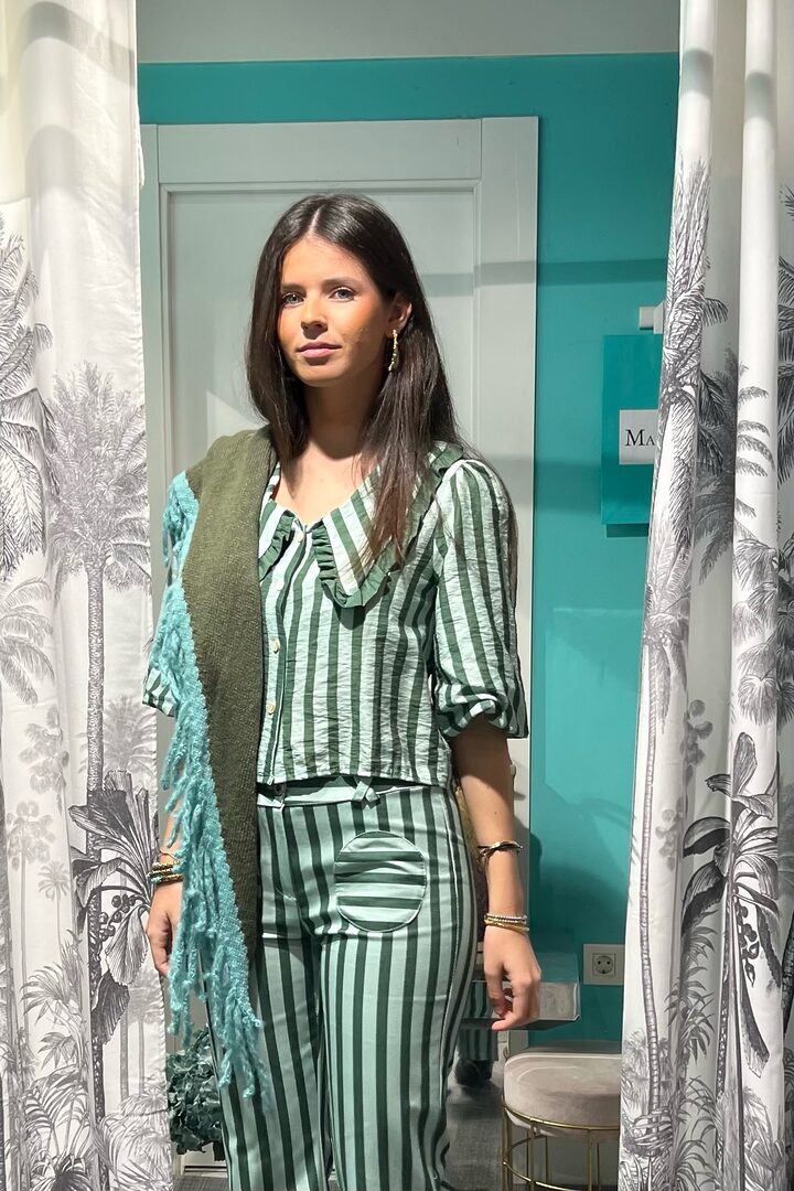 Blusa Green Alexis. Bonita camisa de manga corta abullonada y grandes cuellos. Realizada en tejido Bámbula con original estampado, ideal para primavera/verano. Lleva bonito ribete rizado en cuellos. Cierre botones, corte recto y largo a cintura (no más).