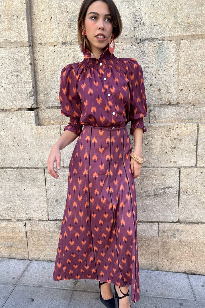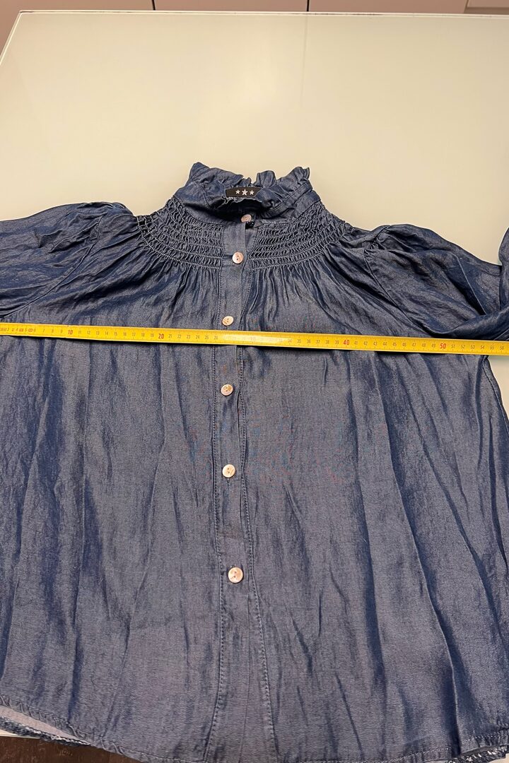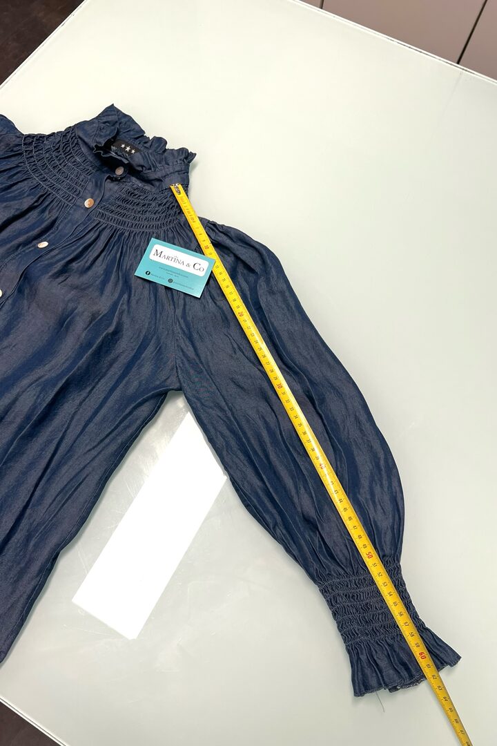 Bonita blusa versátil y elegante. Tejido tejano suave con un ligero brillo. Detalle nido de abeja en puños y cuello. Queda ideal tanto para el día a día o para evento con complementos que realcen el look. La manga queda preciosa puesta. Es muy cómoda de llevar.