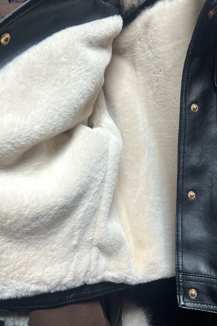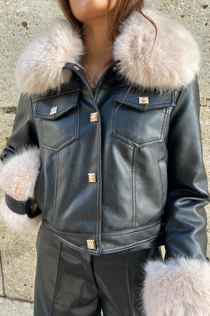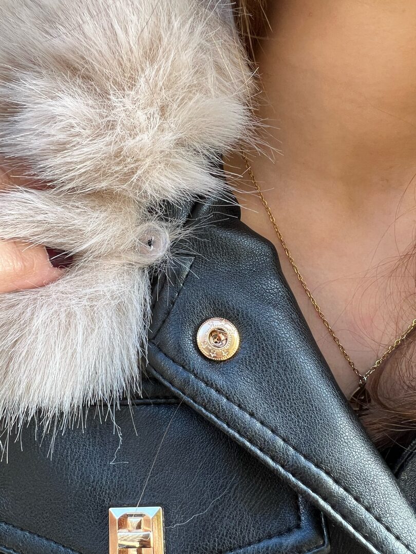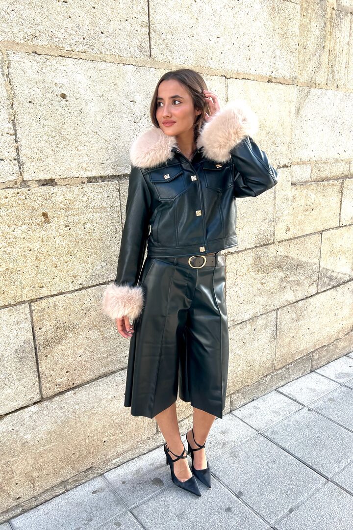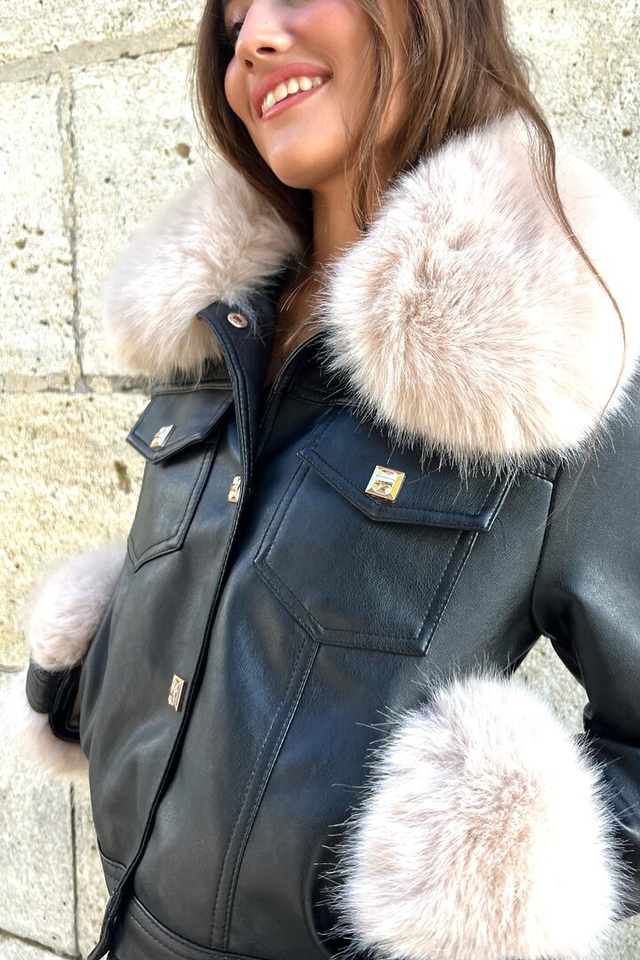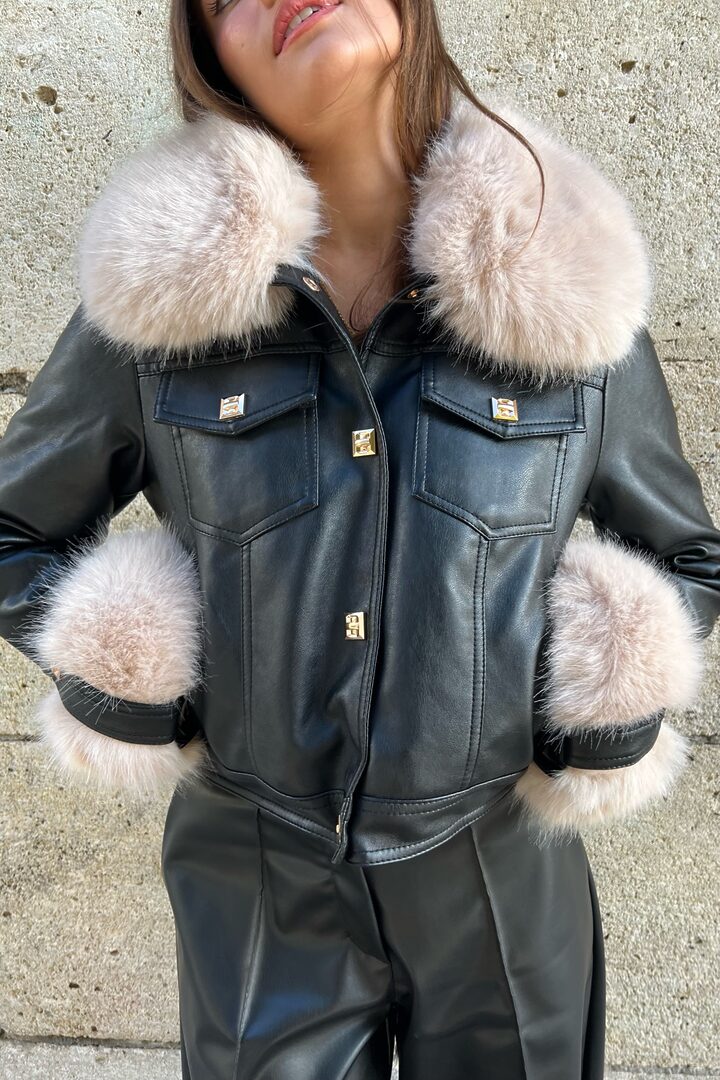 Espectacular chaqueta corte informal cazadora, de puños y cuellos desmontables. Tiene un tacto suave y acolchado. Lleva forro interior de pelo en cuerpo, y satén acolchado en interior de las mangas. Bolsillos a ambos lados. Cierre de bonitos broches latonados.