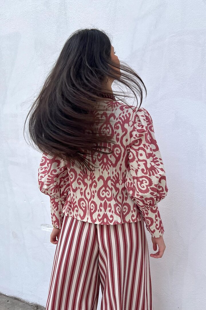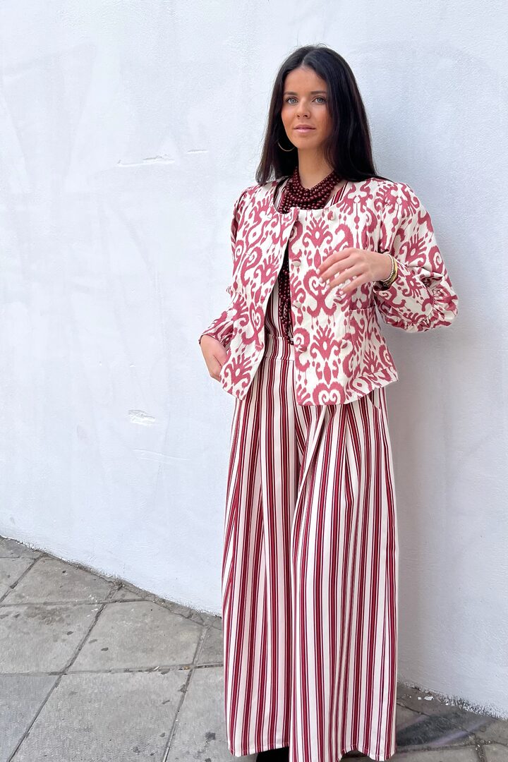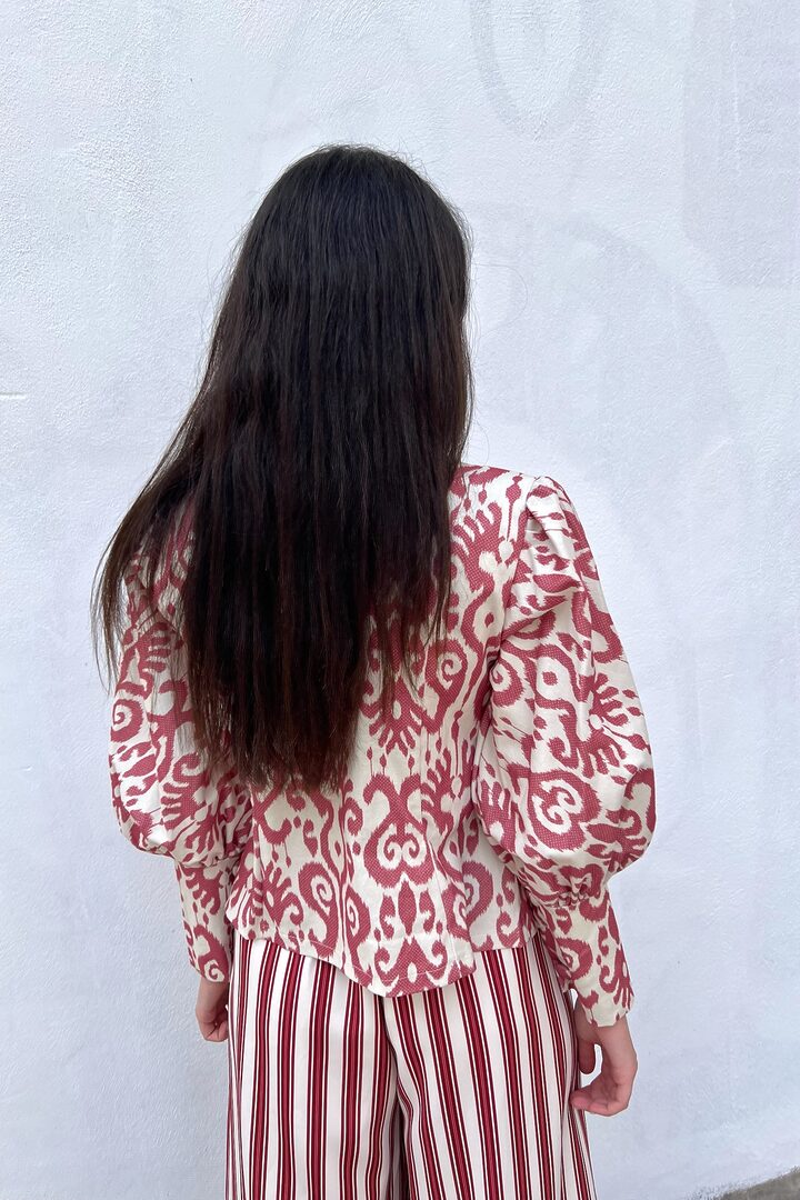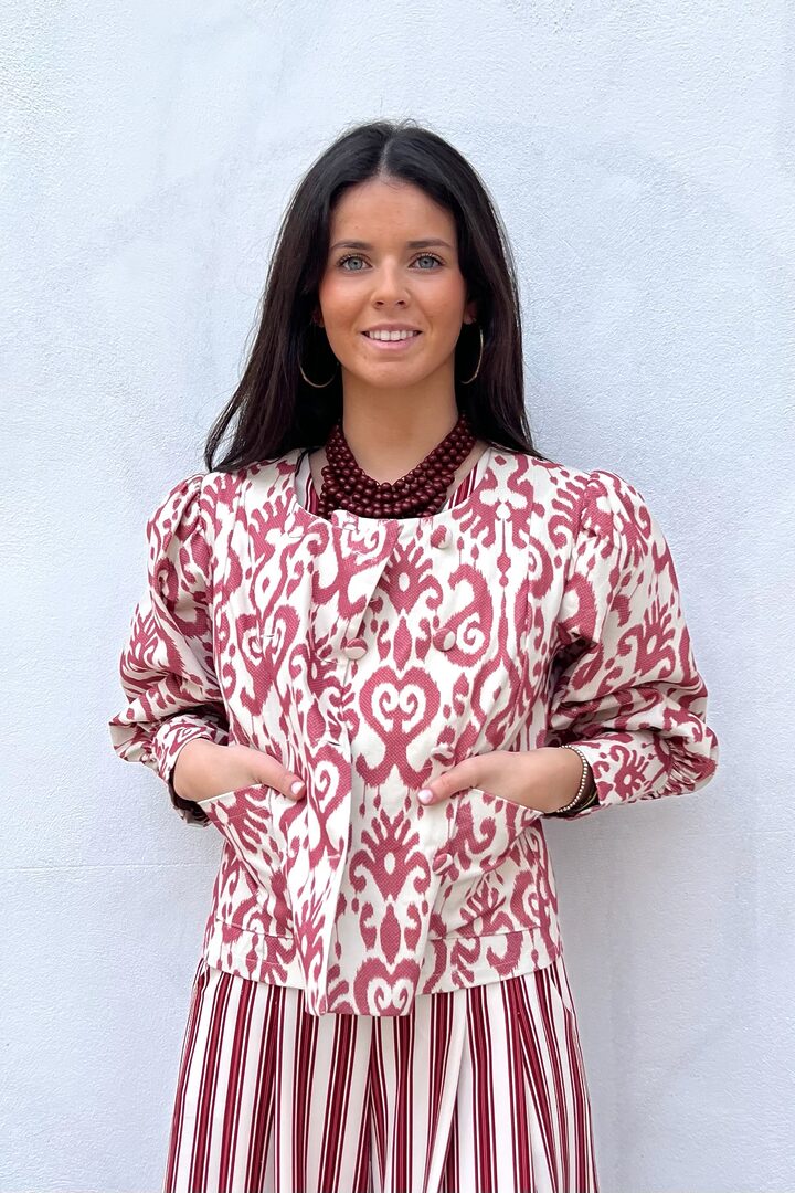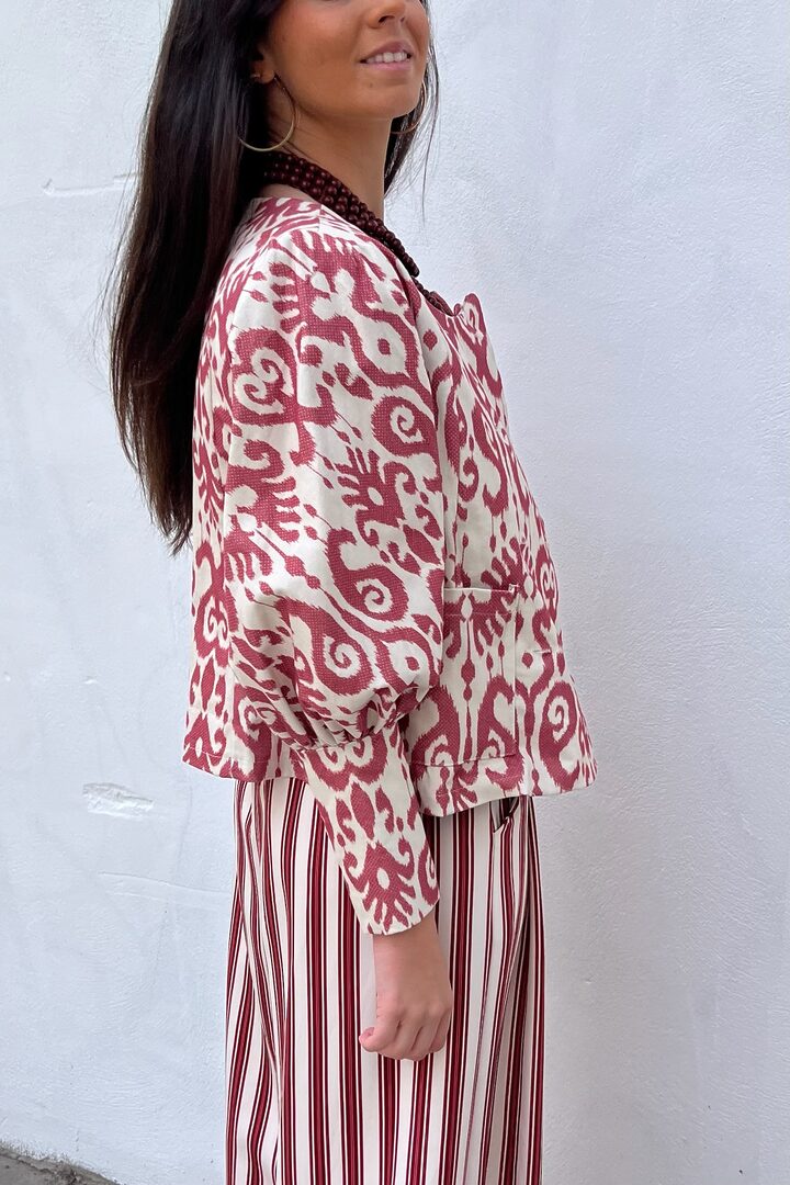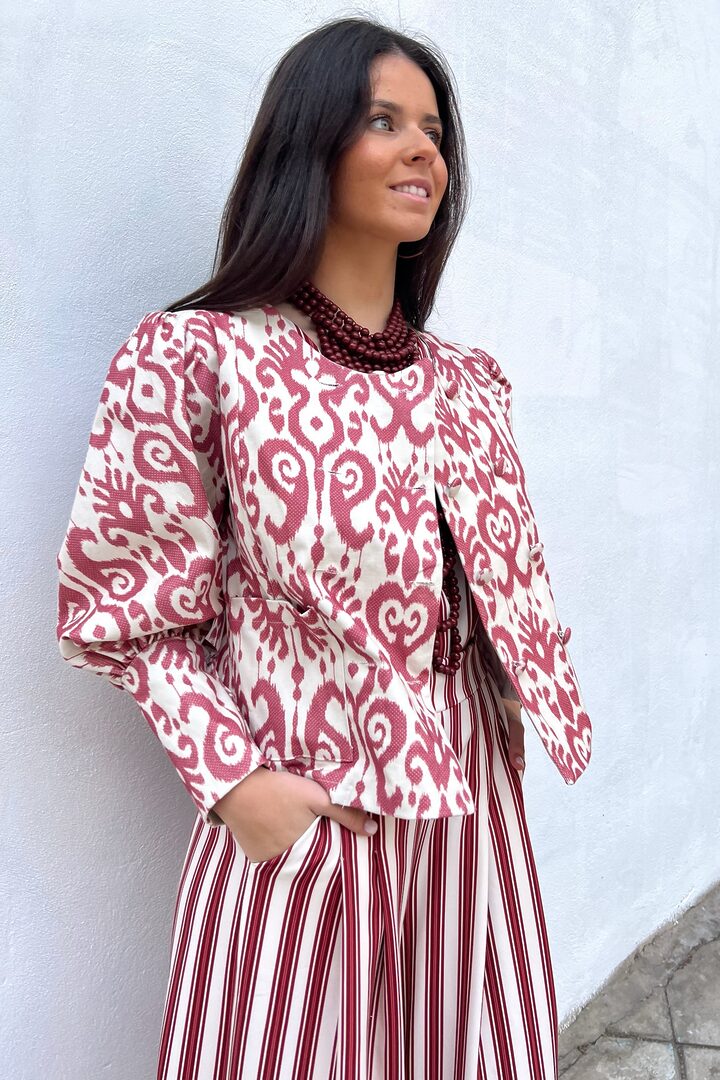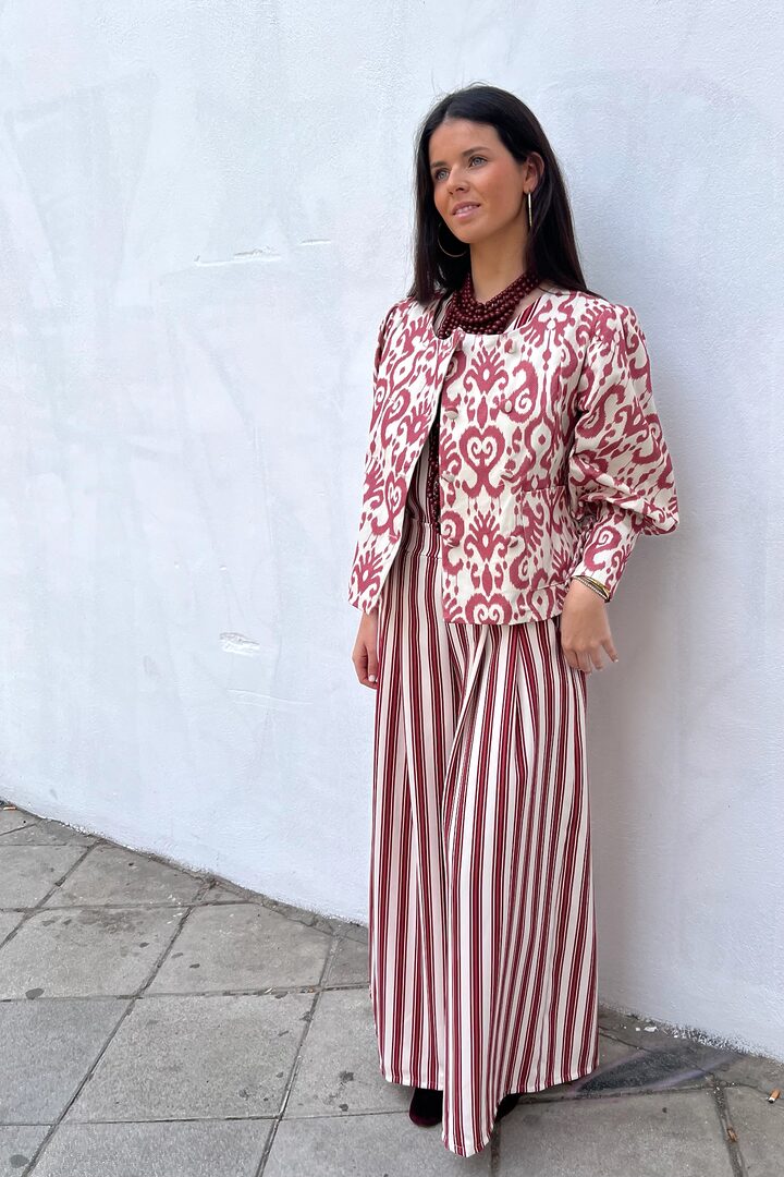 Chaqueta Camelia. Ideal para día especial o evento, o para ir «de guapa» con tejano. Es corta y evasé… con bonito puño alto que estiliza y le da elegancia. Doble abotonadura. Lleva hombrera y bolsillos de tapeta.
