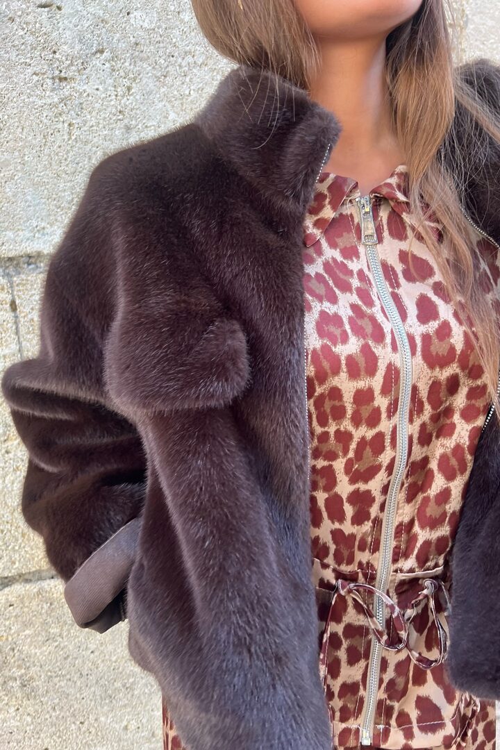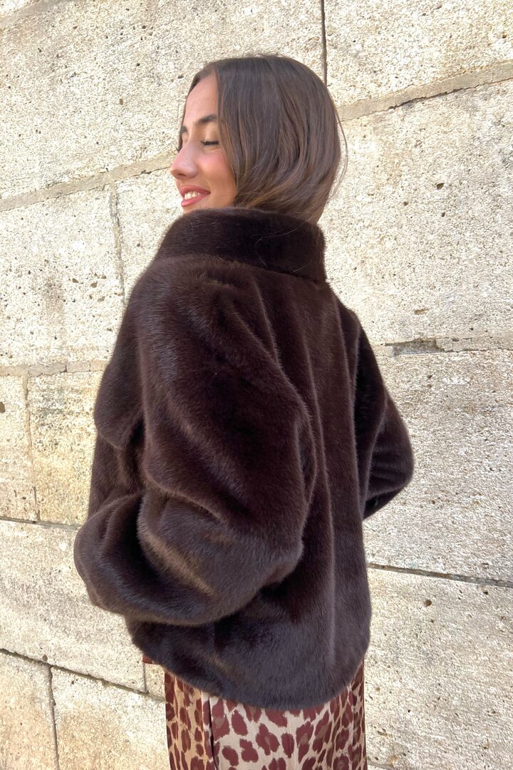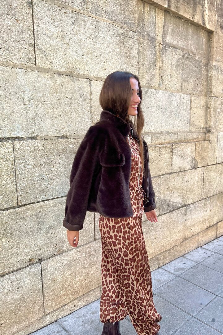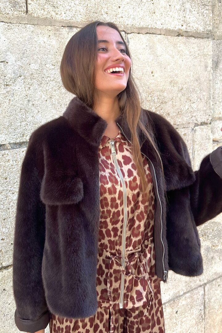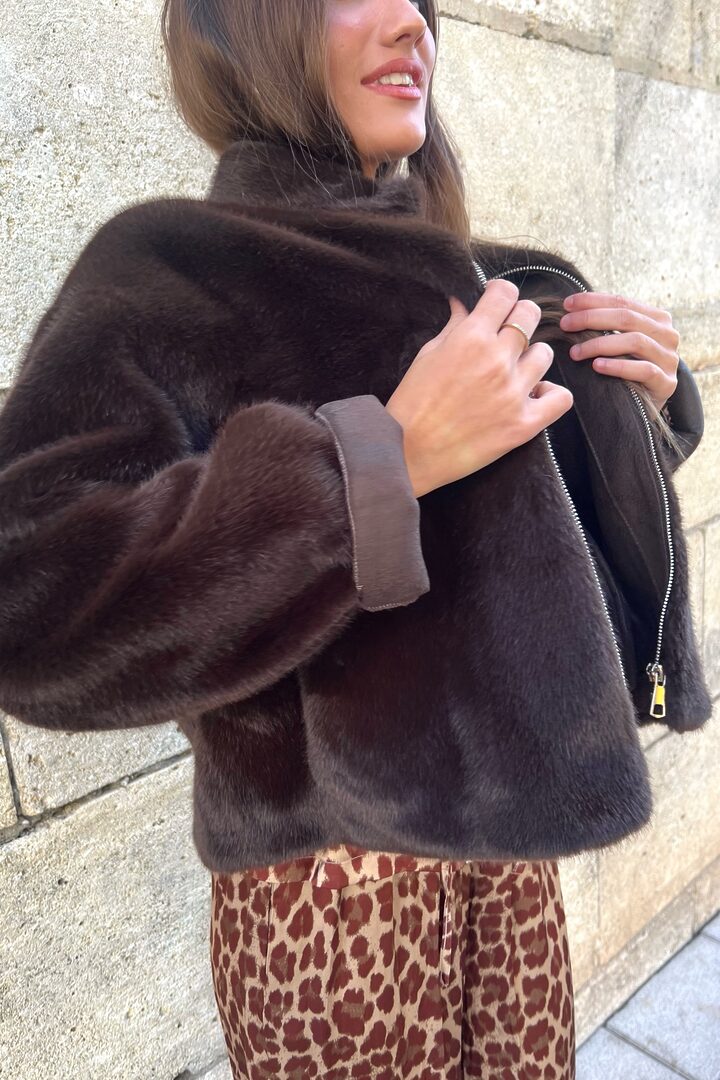 Muy confortable y no pesa nada! Cazadora con forro imitando piel vuelta( no queda mal reversible). Lleva bolsillos y su cierre es de cremallera. Bonito cuello tipo MAO , y tapetas en pecho simulando bolsillos. Aparte lleva bolsillos laterales. Lava en casa a 30º.