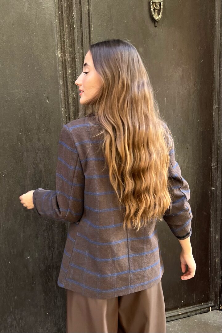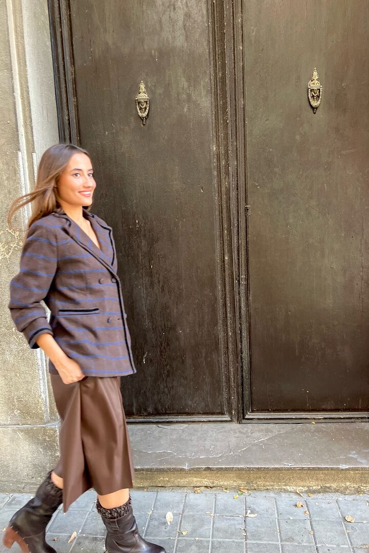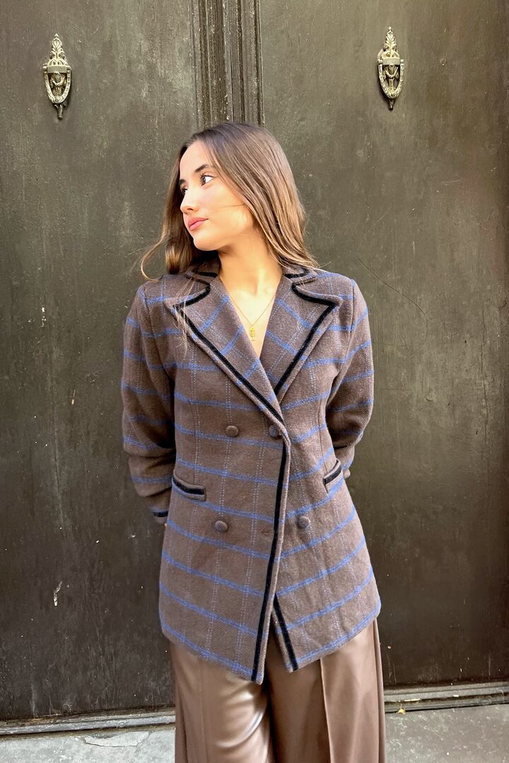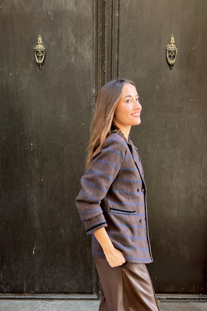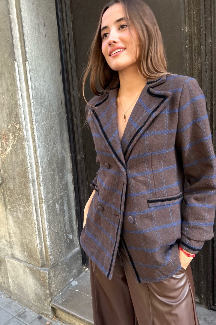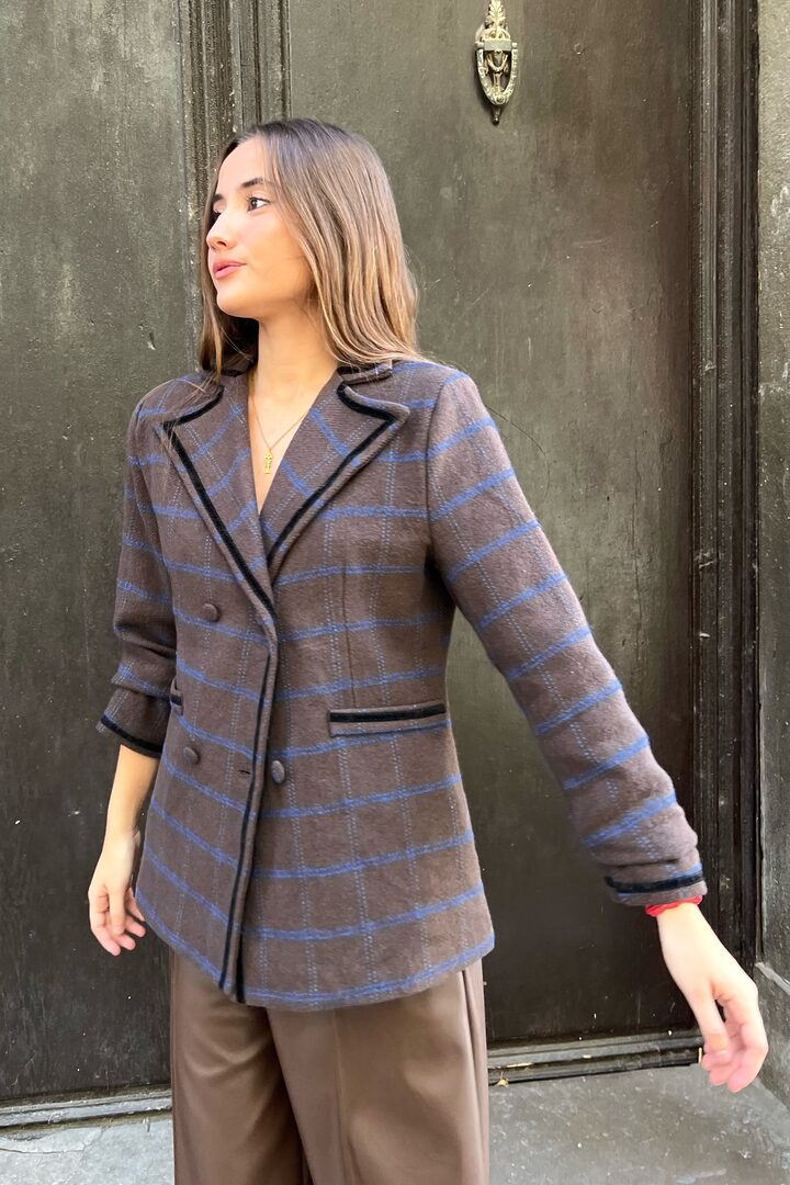 Ideal chaqueta cruzada de corte clásico actualizado y elegante, pero juvenil. Tejido grueso con lana, bastante abrigada. Lleva forro interior satinado, hombreras ocultas y bonito ribete de terciopelo negro, realzando la silueta de la chaqueta y puños. Sirve de abrigo corto de lo abrigada que es.