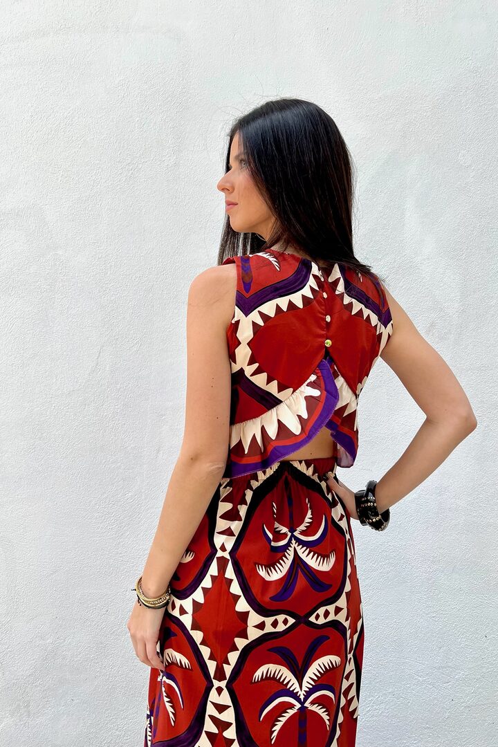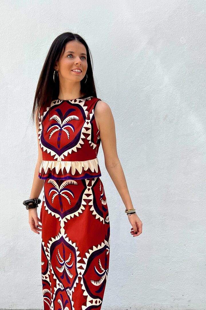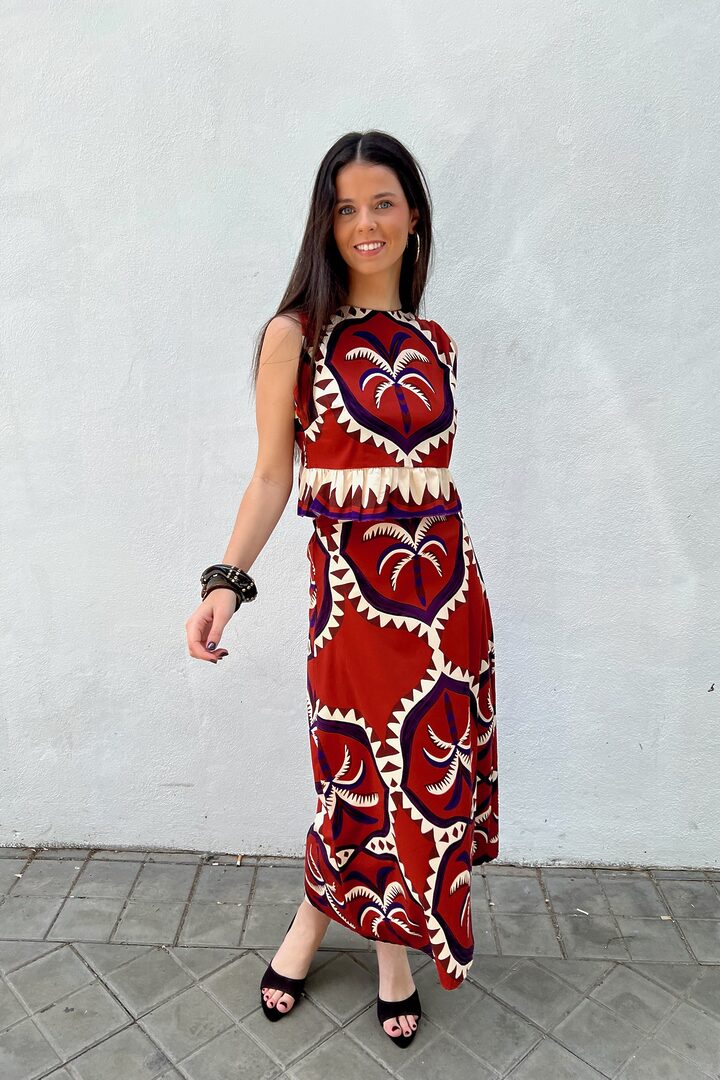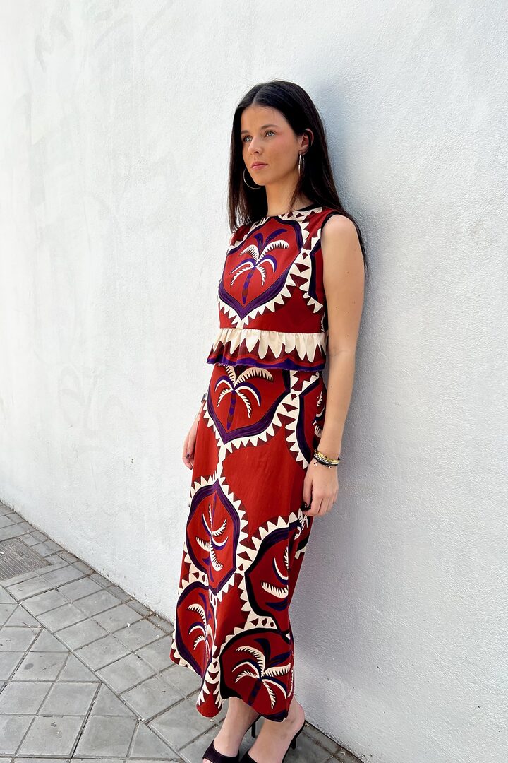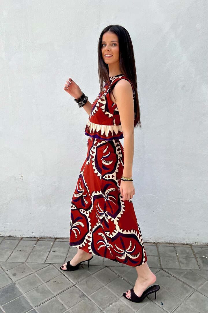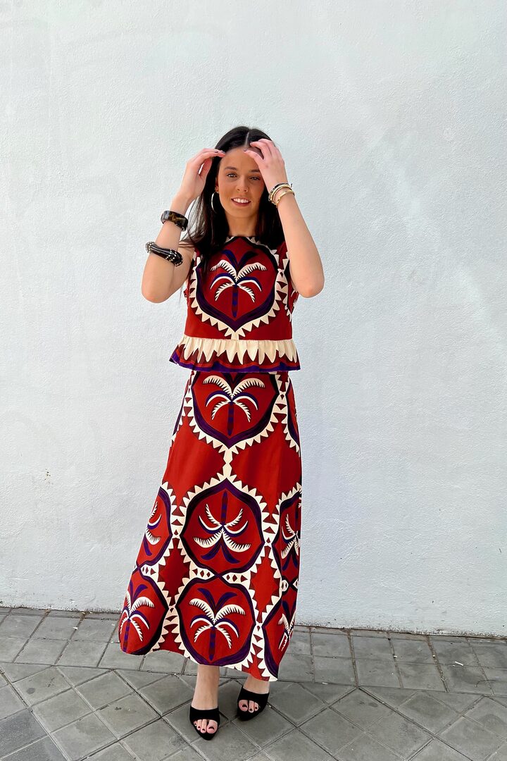 Conjunto Kalika. Set de top y falda super bonito y fresquito. Tejido suave con algo de elastano. La falda tiene corte evasé, largo midi y cintura elástica forrada en parte trasera, para mejor ajuste a varias tallas. El top es de corte recto, con pinzas y bonitos detalles en espalda. Cierre con 4 botones.