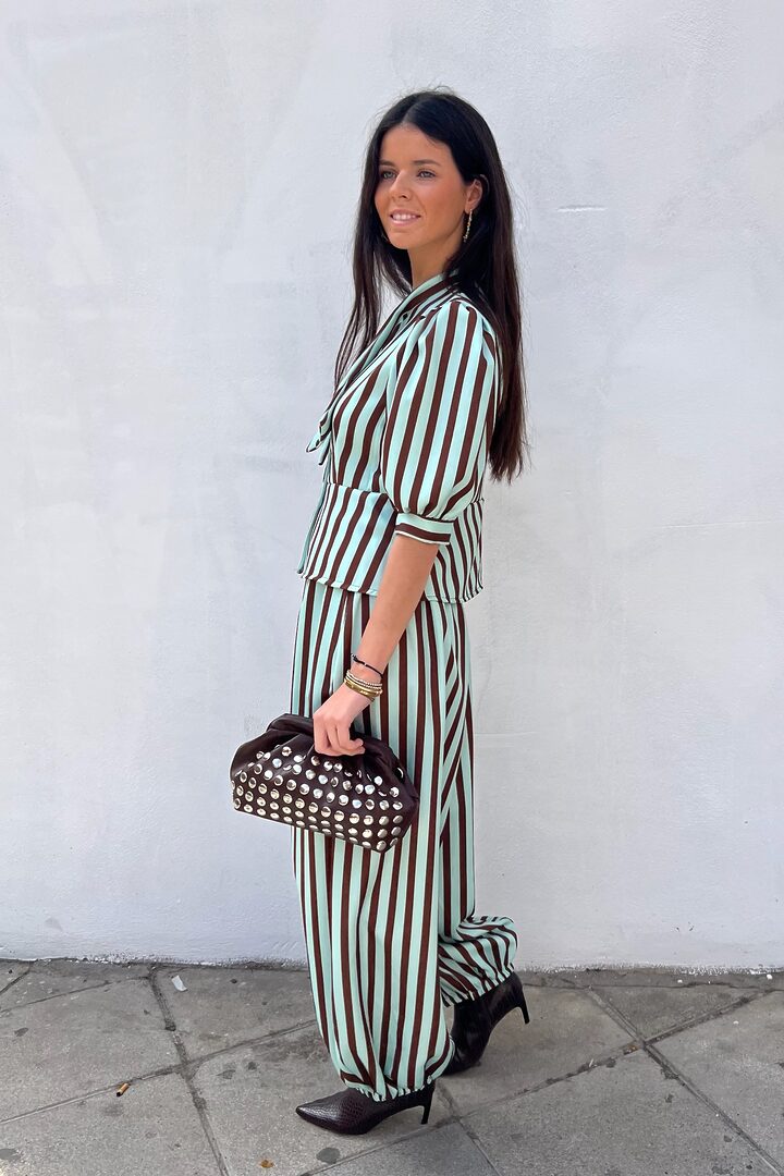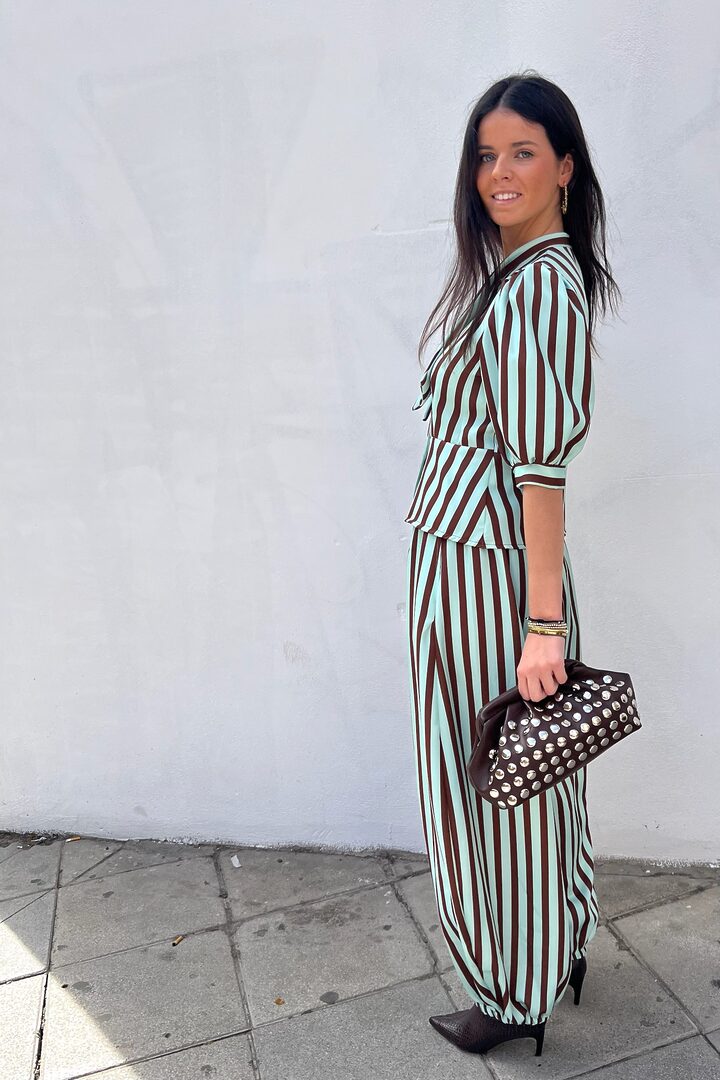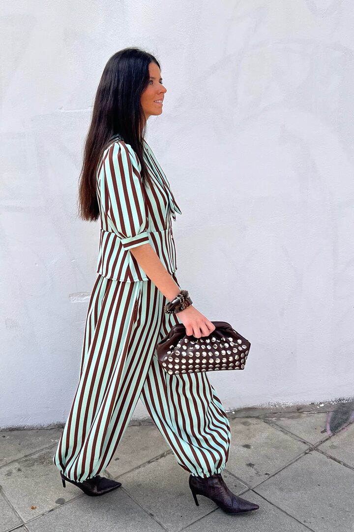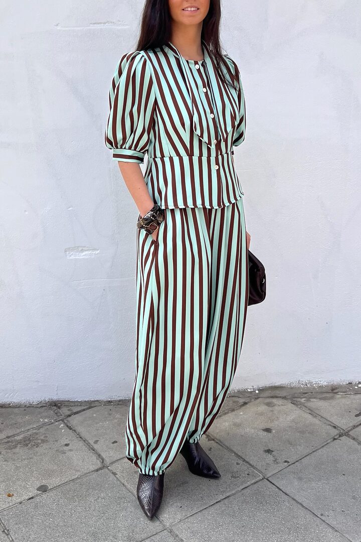 Conjunto Sweet Gladis. Ideal set de 2 piezas para evento o día especial. Tejido satinado de tacto muy agradable y con cuerpo. Top (también puedes llevarlo abierto a modo chaqueta) manga al codo, corte cintura alta, cierre botones y detalle lazada pequeña en cuello (puede llevarse suelto también). Pantalón bombacho ancho con bolsillos y cintura elástica para mejor ajuste a varias tallas.