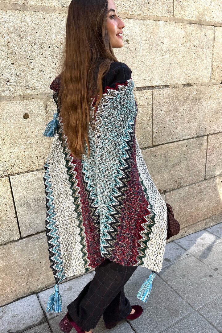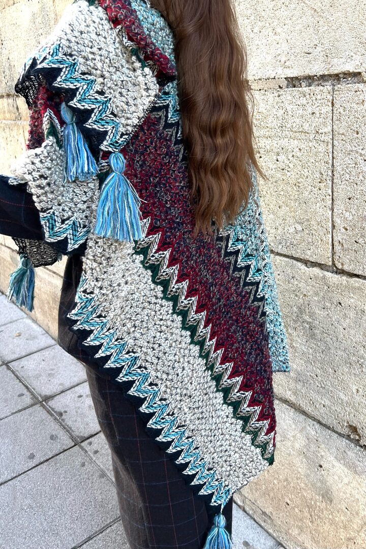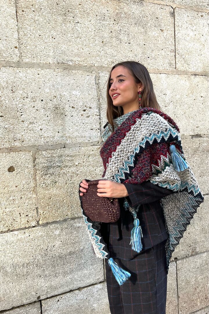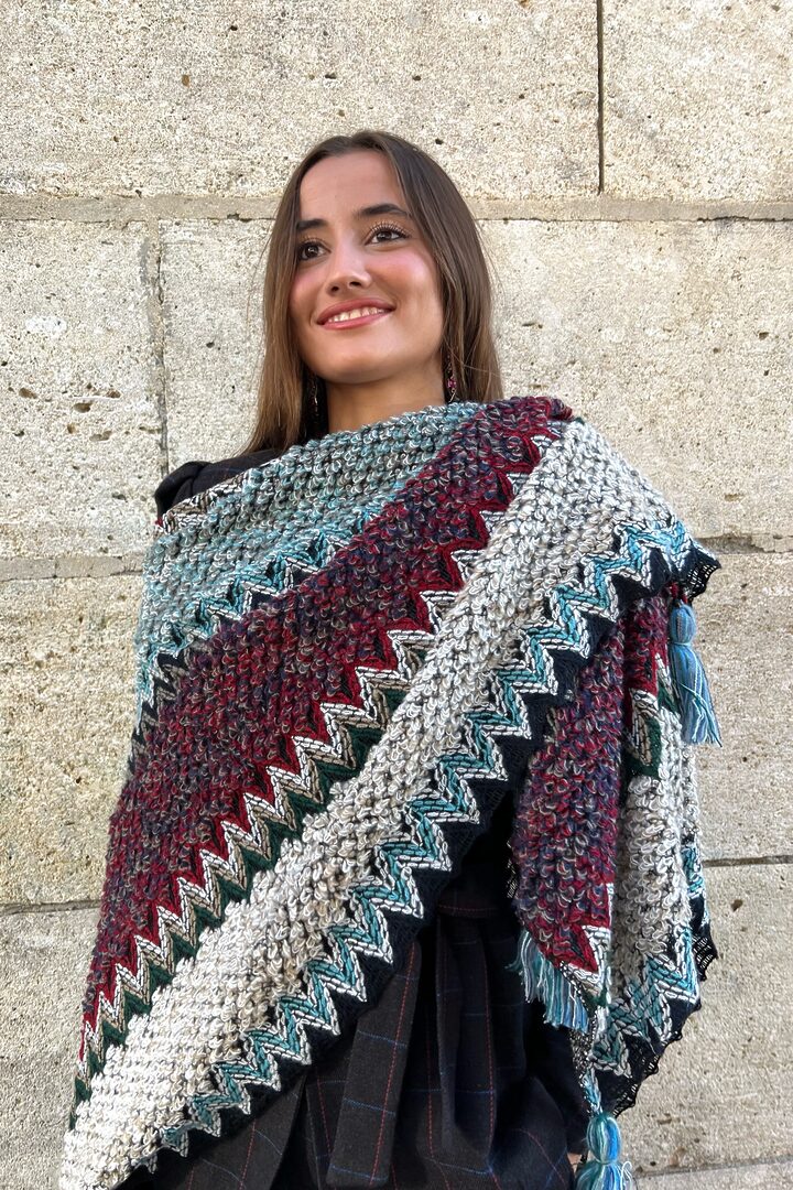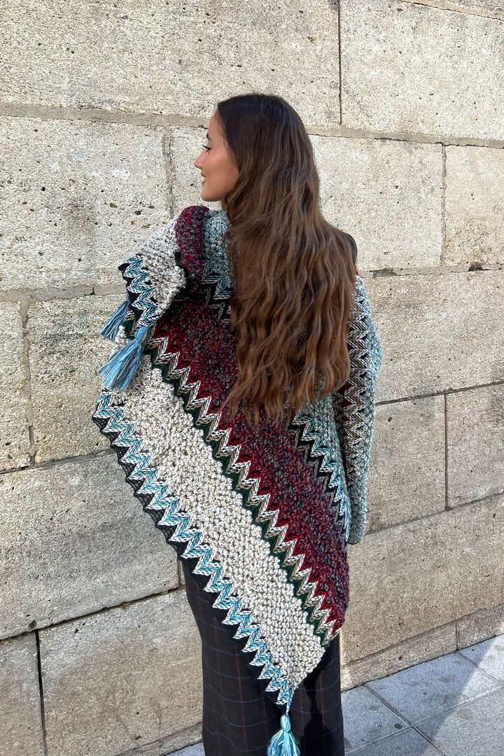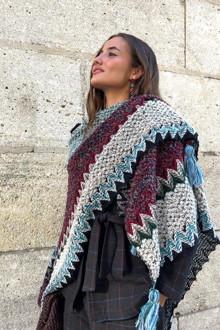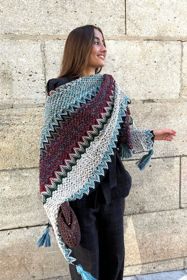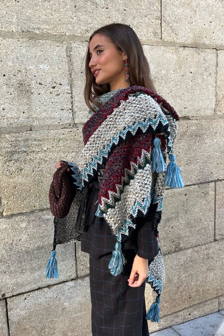 Chal o echarpe de punto para llevar encima de chaqueta, abrigo o blusa. Es elegante y a la vez informal con esos pompones que caen en las esquinas del chal. Combina muy bien con los colores de temporada y además abriga bastante.