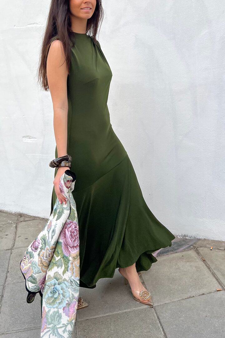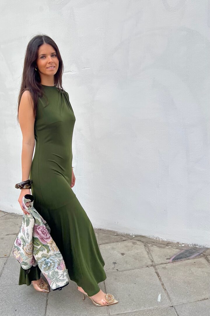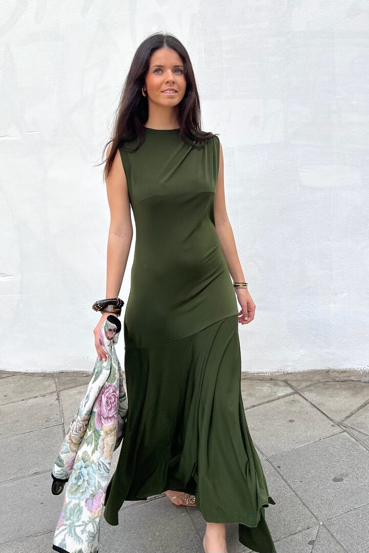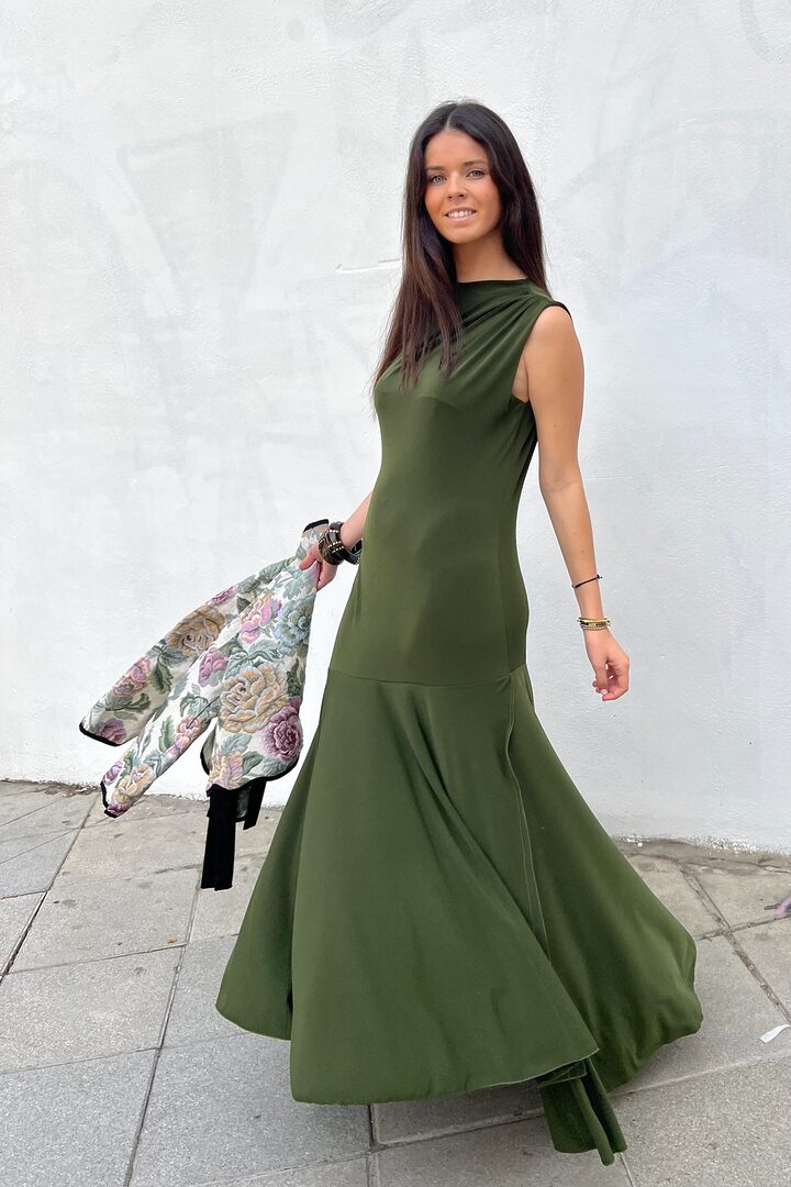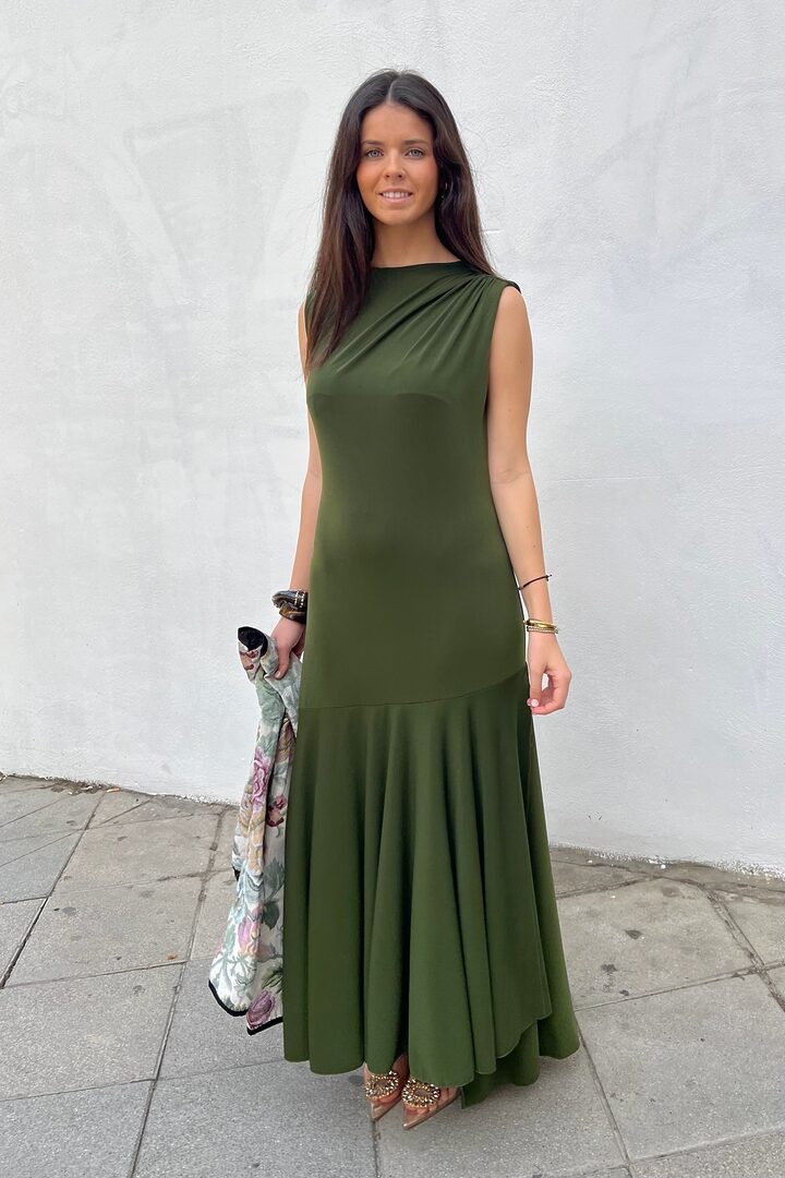Vestido Dorotea Green. Este vestido es sencillo y elegante, buen fondo de armario para esta temporada. Tejido satén con elastano, lleva rizo en uno de los hombros. Forro interior. El diseño de doble volante inferior le da ese toque tan especial y elegante movimiento.