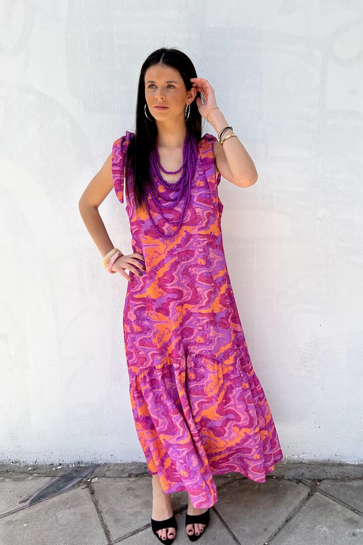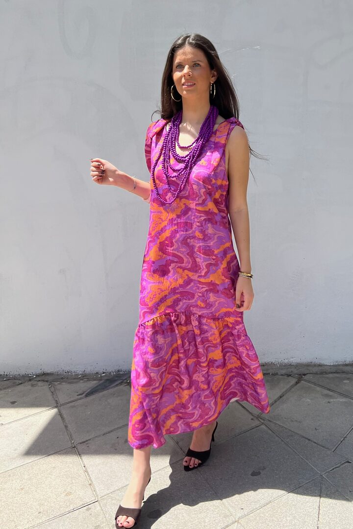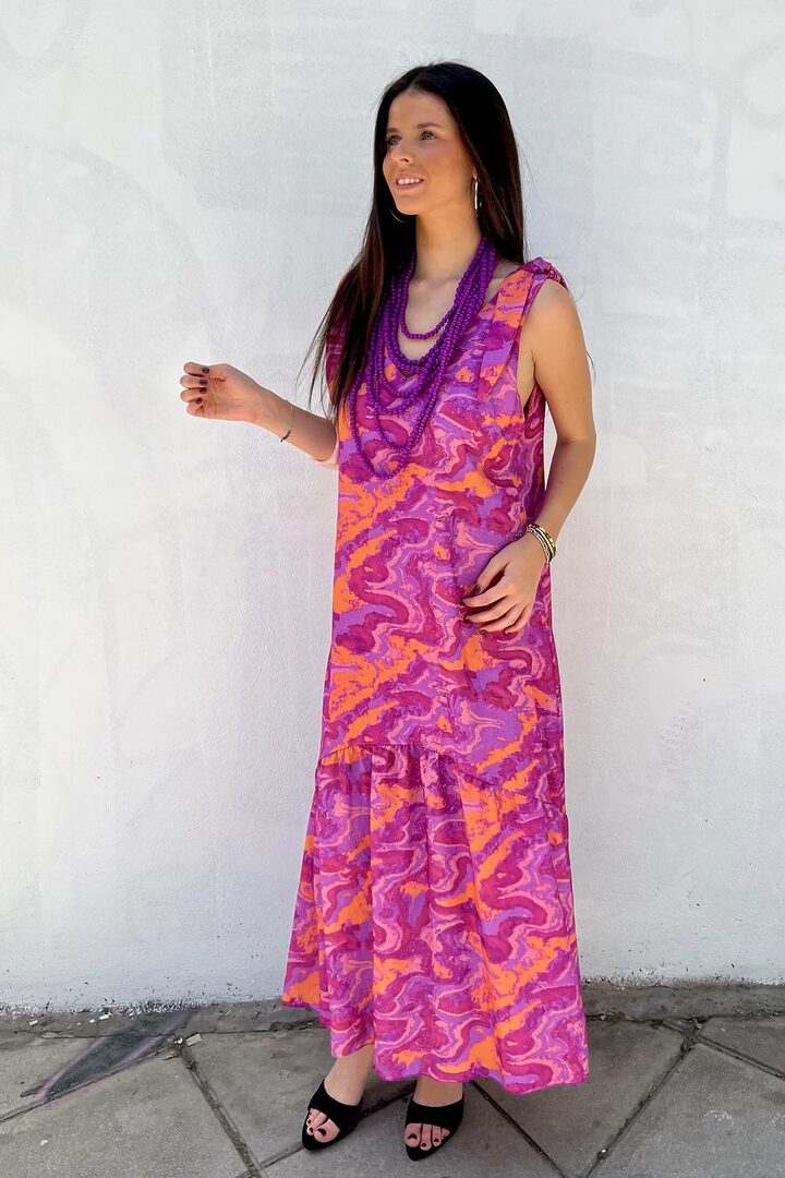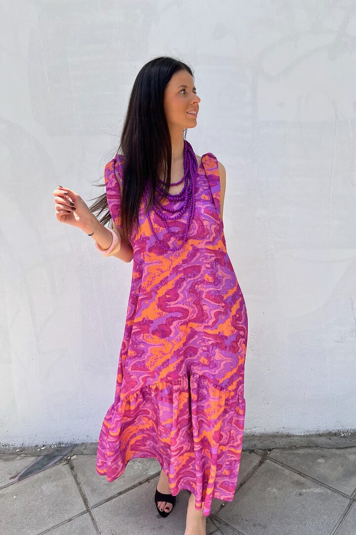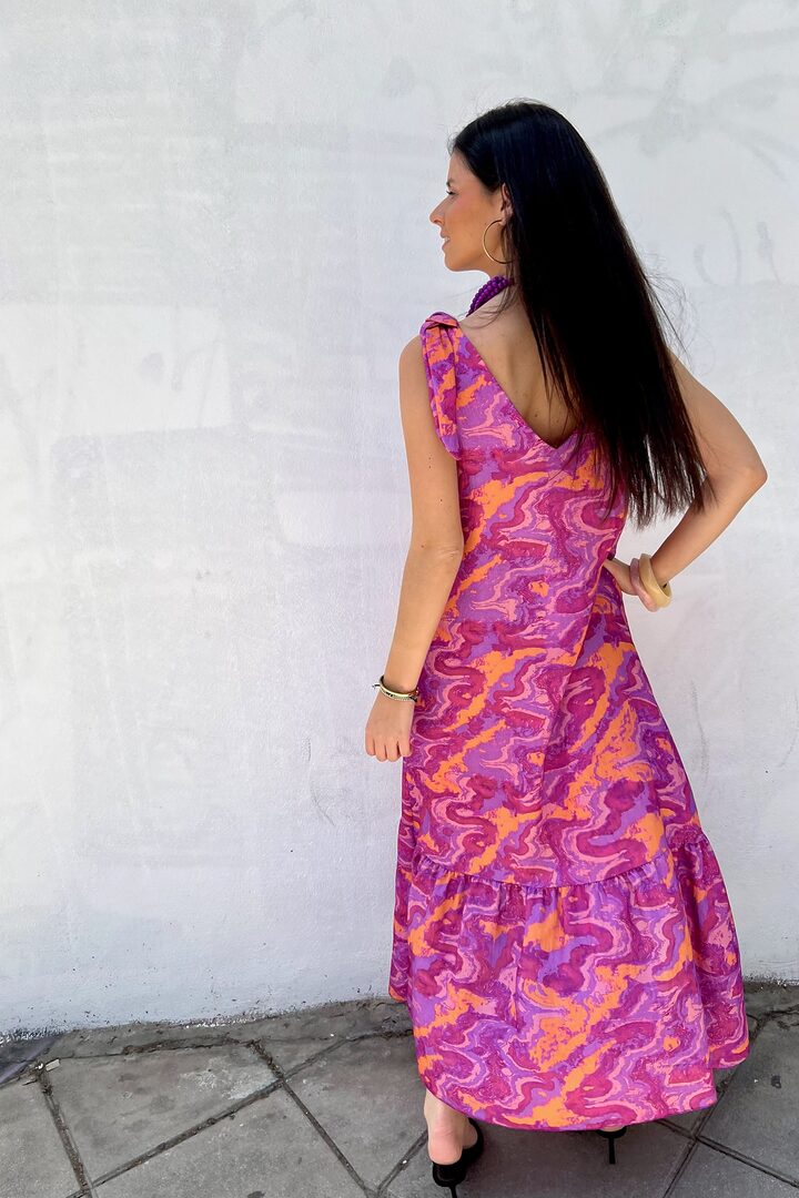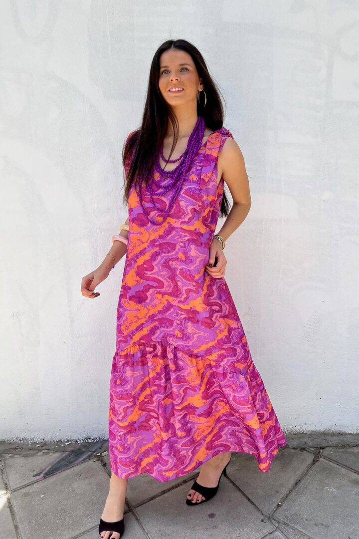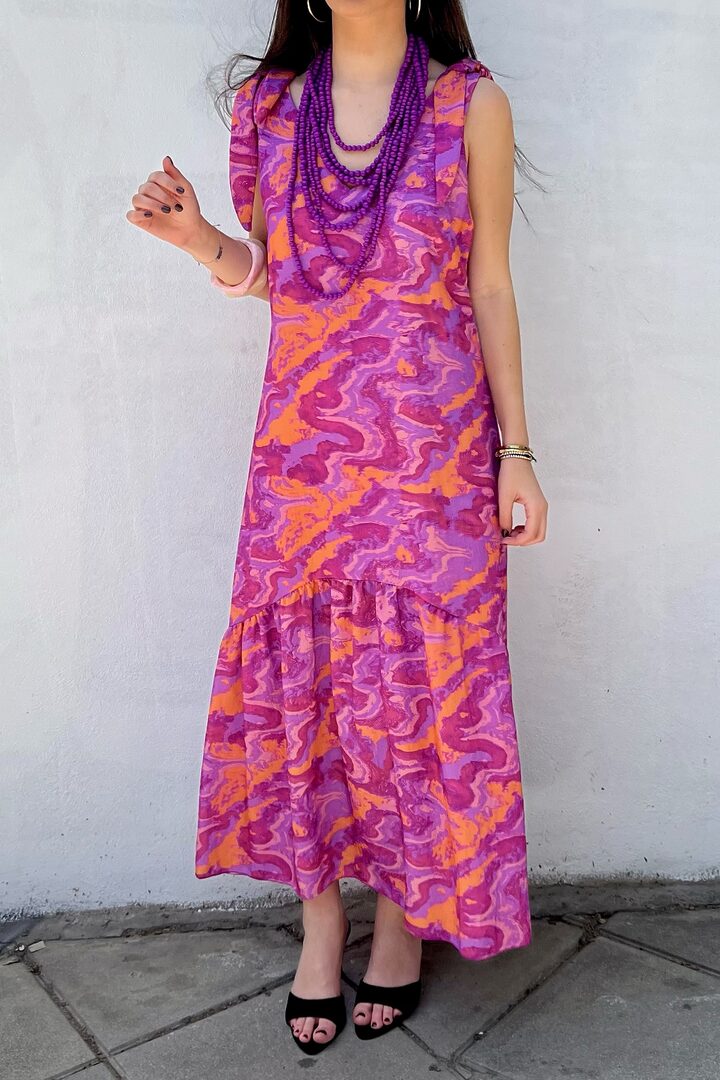 Vestido Julieta. Vestido largo sencillo y elegante. Original combinación de colores, largo a tobillo con gran volante inferior que hace pico delantero, lo que le da más vuelo. Tirantes con lazo simulado y pinzas en pecho.